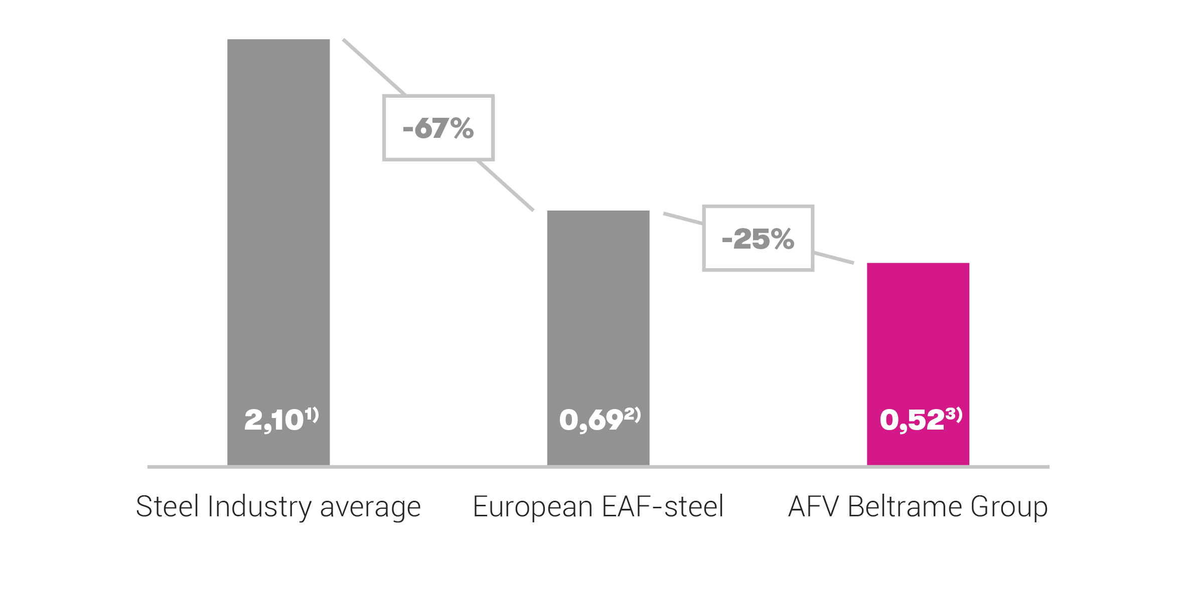 Sources: 1) Word Steel Association CO2 emission average (Scope 1+2+3 melting shop) integrated with external database CO2 emission average for Scope 1+2+3 rolling mill; 2) European Commission benchmark value ‘21-’25 for EAF carbon steel (Scope 1+2 melting shop) integrated with elaborations based on external database inputs for Scope 1+2+3 rolling mill and Scope 3 melting shop; 3) AFV Beltrame Group Scope 1+2+3 melting shop and rolling mill calculated applying market-based approach for Scope 2.